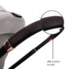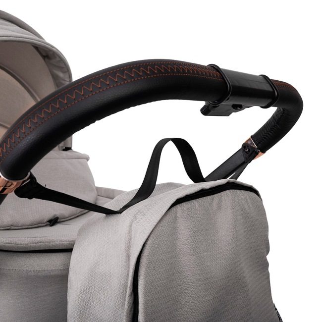 -Nahrbtnik ima nastavljive naramnice iz zračnega mrežastega materiala, naramnice s kavlji, dva stranska žepa za dodatke in vlažne robčke, zadrgo za širok notranji prostor, notranje žepe in ročaj za nošenje.